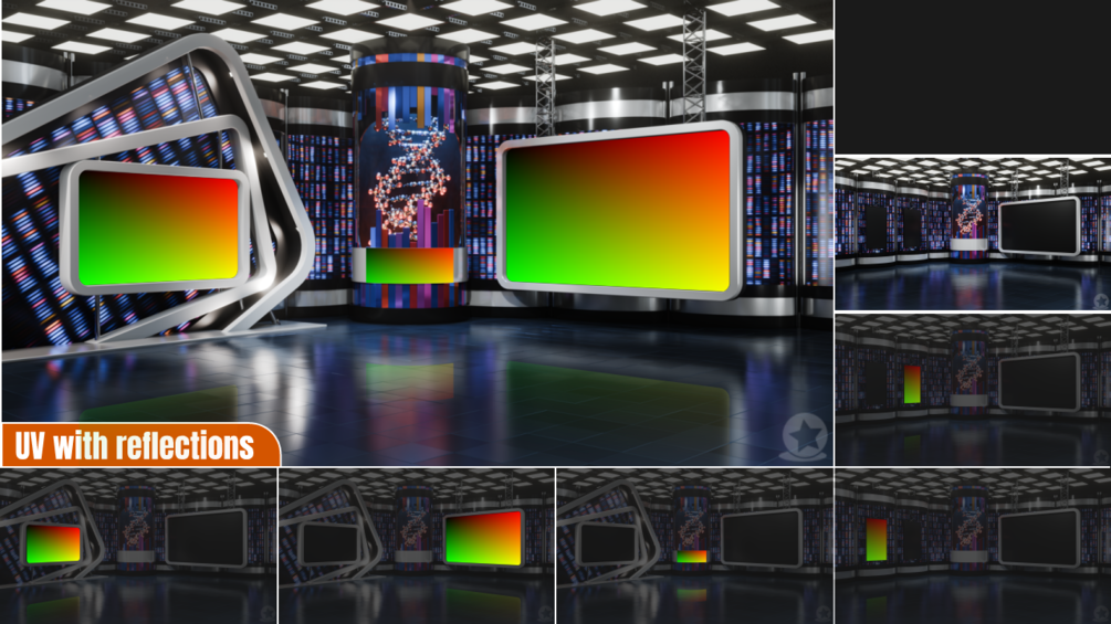 Each monitor has its own UV map to project content, complete with reflections on the floor.